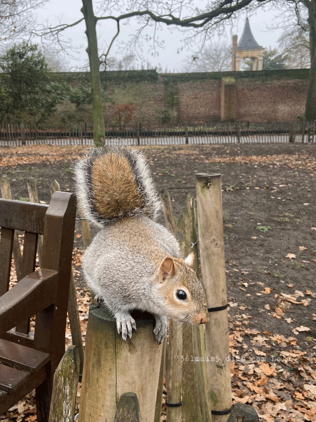 O silêncio é rompido pelo ruído do vento, de alguns passantes e dos esquilos que estão curiosos. Mas ela continua - está imersa no seu fazer.
