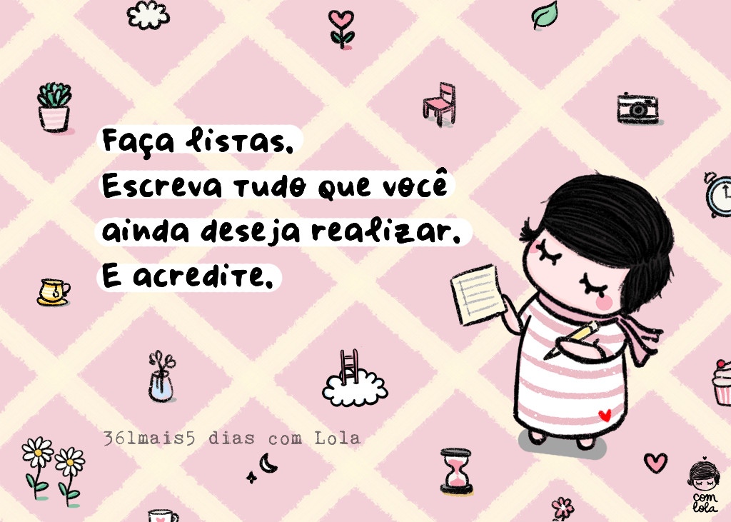Faça listas. Escreva. Não se cobre. Apenas anote. Risque (com força) aquilo que conseguiu realizar. Às vezes, acontece simplesmente das palavras nos escaparem, dos desejos serem amortecidos e das ideias nos escapulirem. Então, anote seus pensamentos e faça listas do que deseja realizar.
