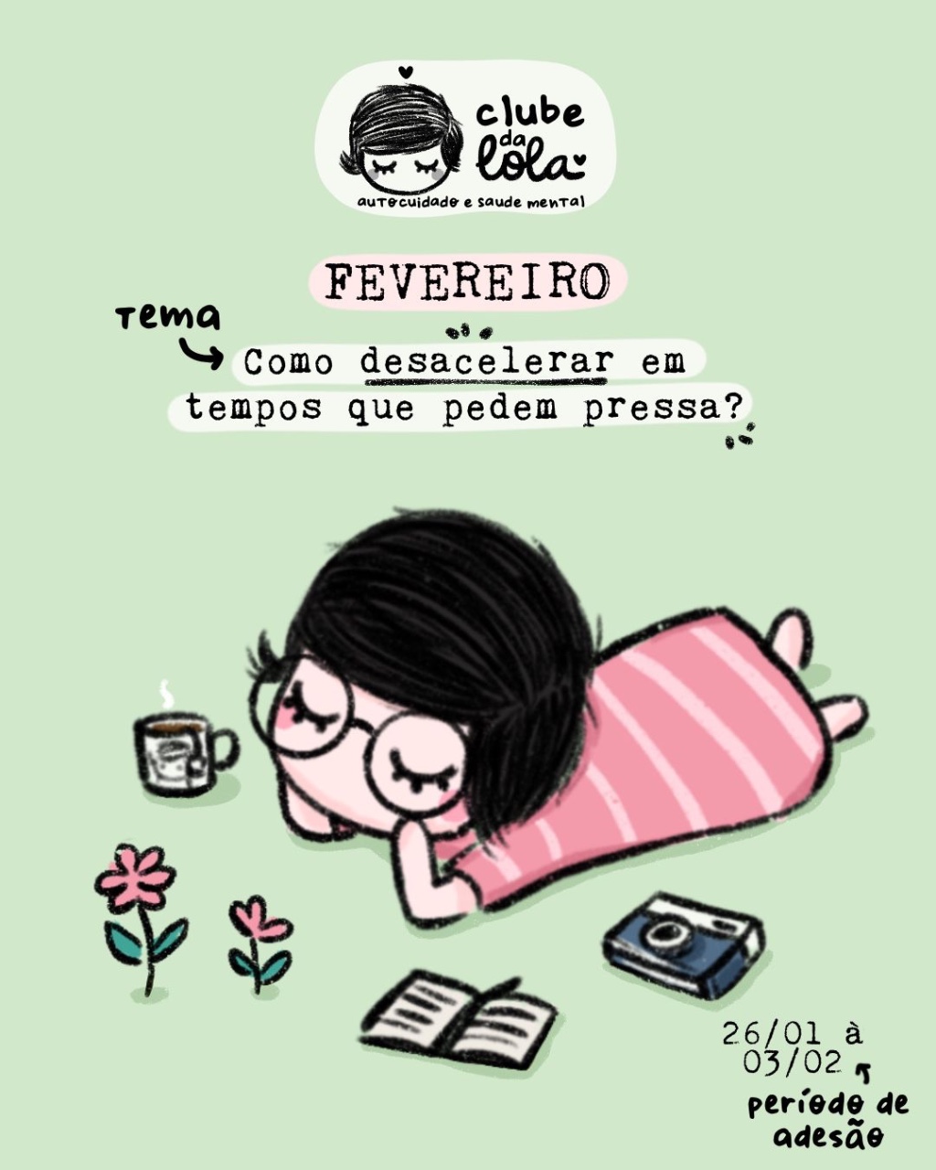 Desacelerar será o tema do clube da Lola no mês de fevereiro! Ainda dá tempo de assinar! Clique e saiba mais.