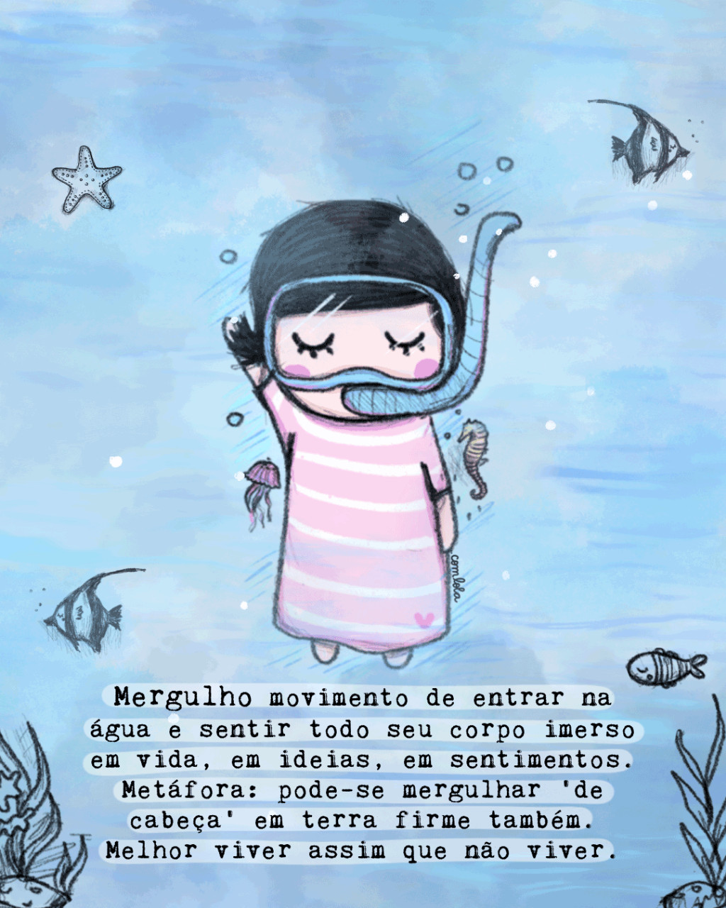 Hoje eu moro longe do mar. Mas nasci com ele e me sinto como se carregasse um pouquinho das suas ondas dentro do meu peito. Tenho uma alegria imensa de ter escrito a pequena enciclopédia da vida do mar. Para escrever, mergulhei fundo dentro do meu peito das minhas memórias de infância, da água que sempre me acolheu.