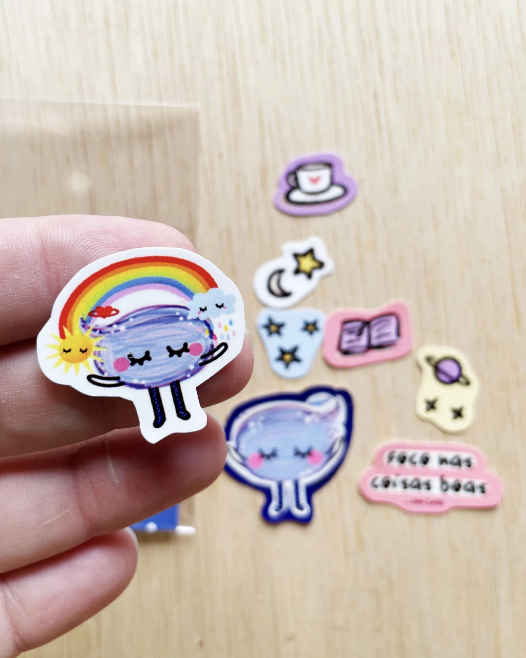 Adesivos para te inspirar a olhar para as coisas boas. Uma mensagem otimista para te ajudar a olhar para seu dia com mais afeto. Aqui Nuni, o universo estrelado, vem te mostrar que as coisas boas estão bem ao seu lado.