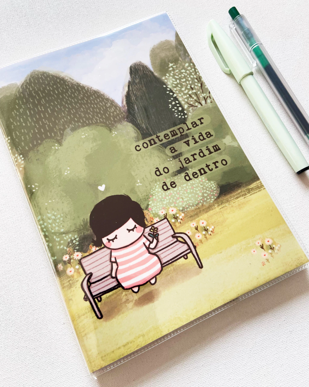Caderno da coleção do livro O Jardim de dentro. Um pequeno livro, poético e profundo, sobre o atravessar da porta para entrar no jardim de dentro. Sobre a delicadeza, a efemeridade da vida e a escolha de viver essa jornada interna de ser feliz contemplando seu desenvolvimento no jardim de dentro.